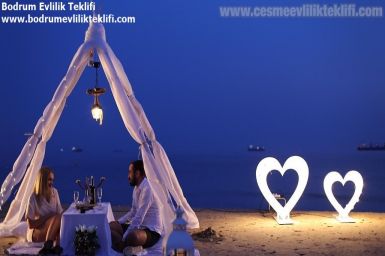 Samimi bir evlilik teklifi yapmak isteyen damat adaylarımız için ideal olan otel konseptimiz sizi dış dünyadan koparıp başbaşa kalmanızı ve doyumsuz romantikliğin tadına varmanızı sağlar. Bodrum'un birbirinden güzel otellerinde uçan balonlar, çiçekler, gül yaprakları, mumlar, sevgilinizin zevklerine uygun özel detaylar ve fotoğraflarla donatılmış bir oda... Müzikler, yiyecekler ve tabii güzel kokular eşliğinde hiçbir kadının hayır diyemeyeceği bir organizasyon. Cesmeevlilikteklifi ailesi sayesinde tepeden tırnağa mükemmel bir süpriz ile sevgilinize unutamayacağı bir evlilik teklifi yapabilirsiniz.
